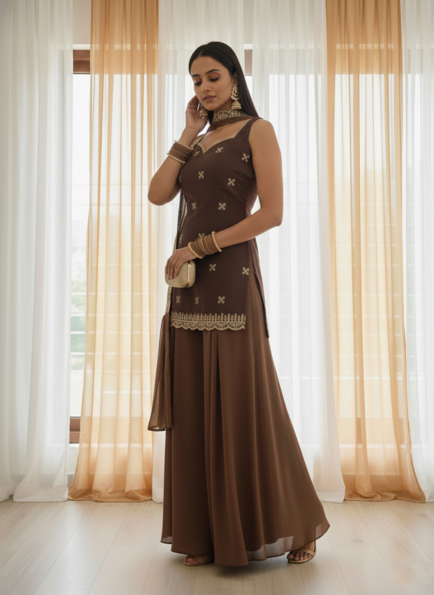 Earthy hues, fluid drapes, and subtle embellishments come together in this elegant kurta set — designed for celebrations that feel intimate and refined.