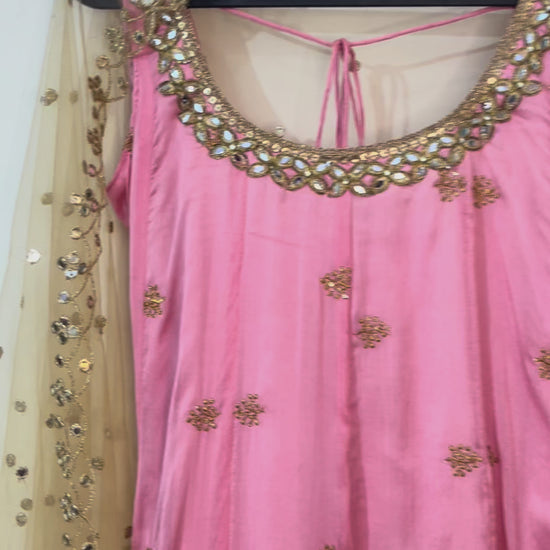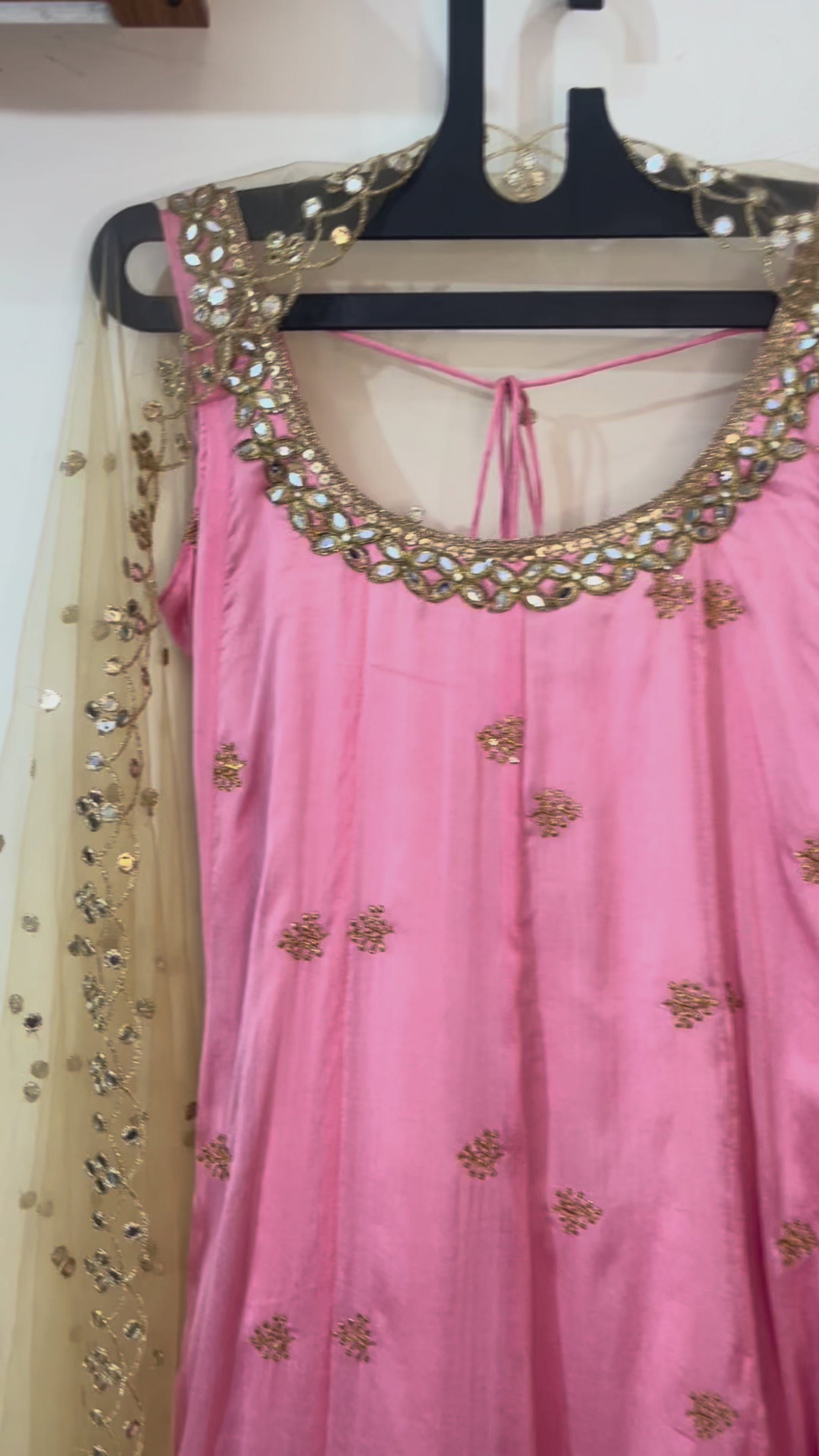 A vision in blush pink, Mahira celebrates elegance in its purest form. Handcrafted with mirror work embroidery along the neckline and borders, and paired with a golden net dupatta sprinkled with delicate sequin and mirror work and paired with a shimmery Gold churidaar, this Anarkali radiates festive allure. Perfect for weddings, sangeets, or intimate celebrations — Mahira glows with the warmth of tradition and the shimmer of moonlight. 🌙✨