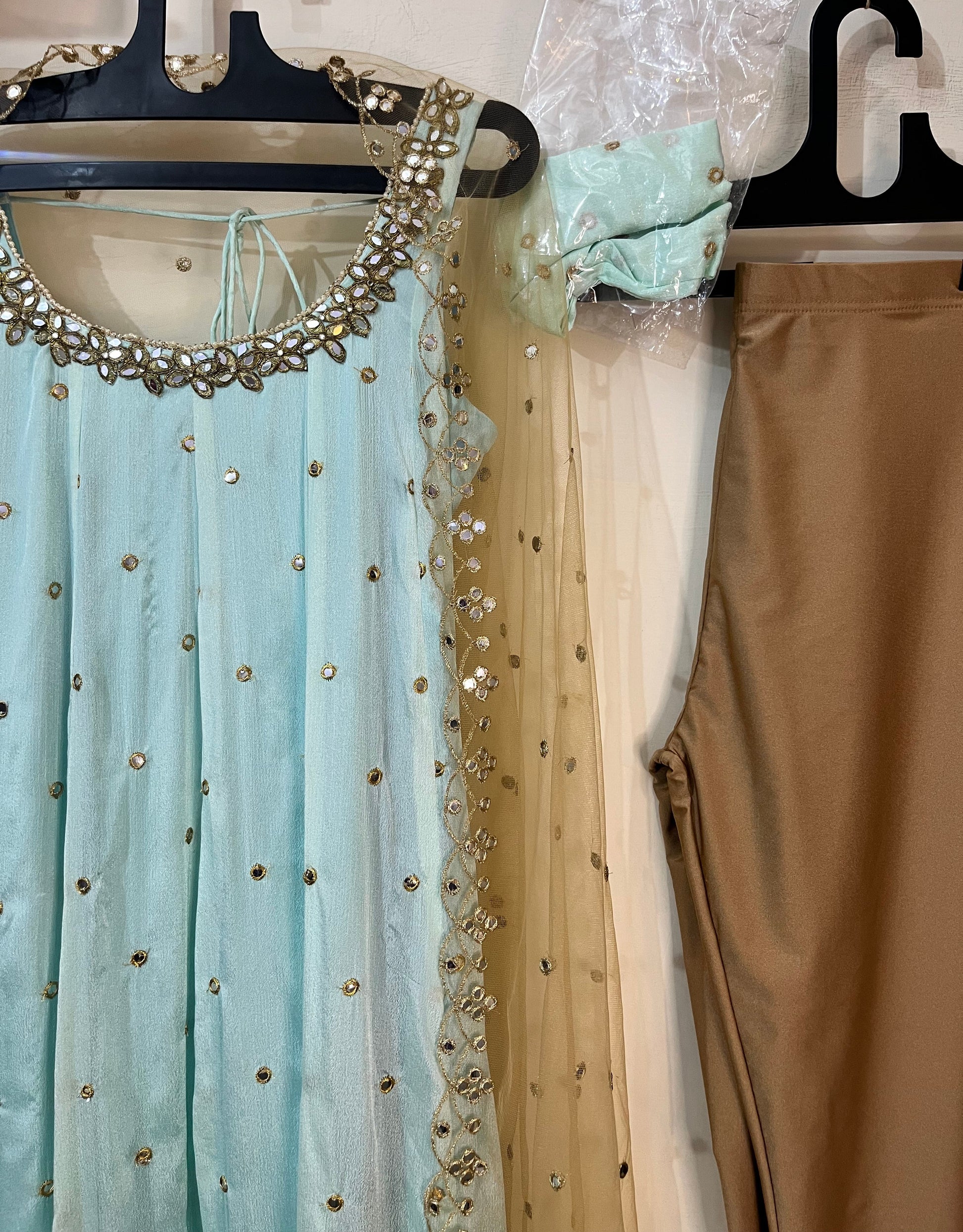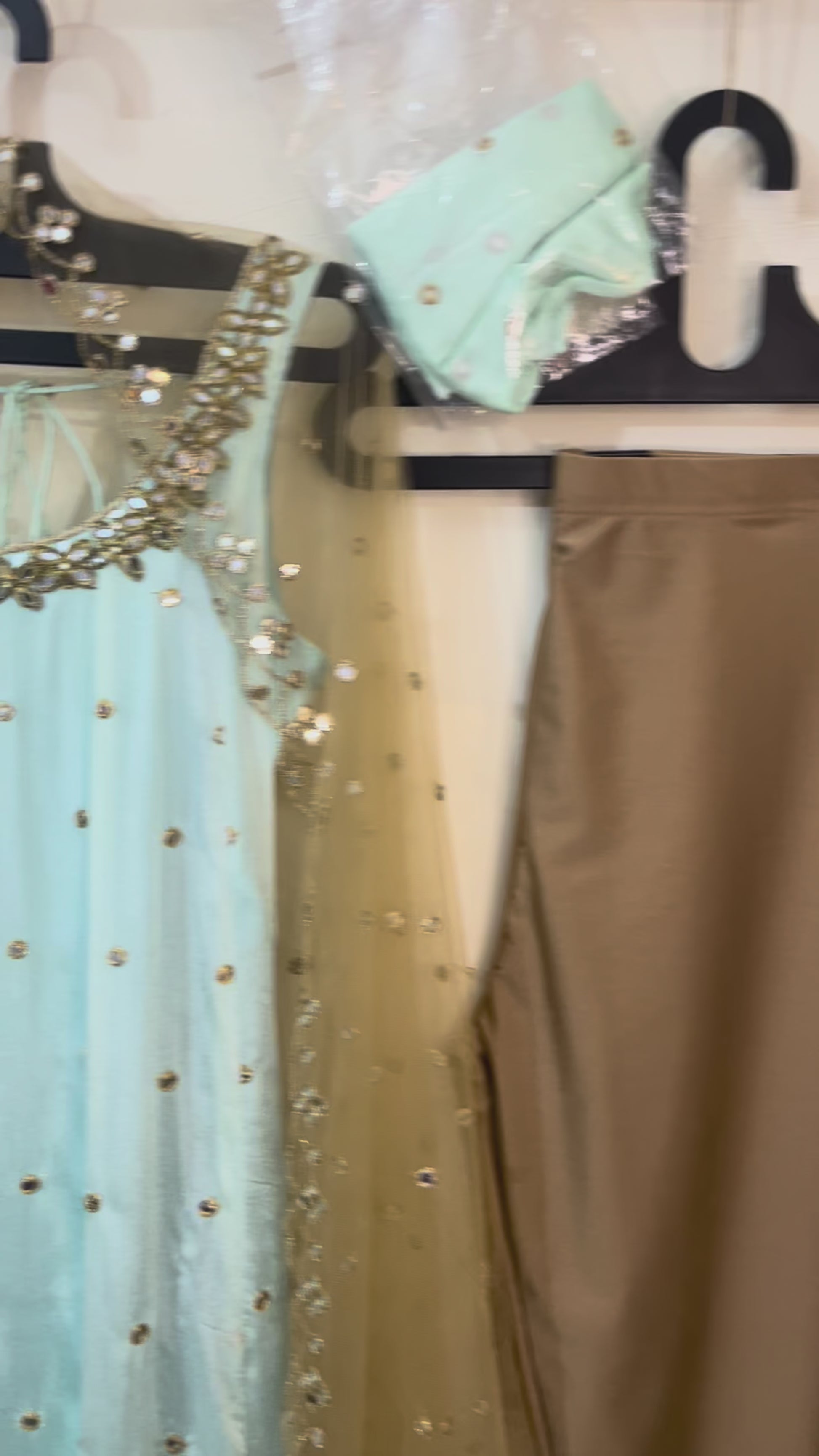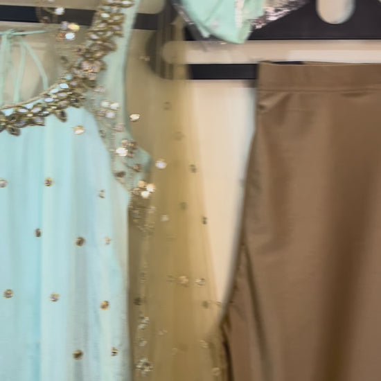 As gentle as the first light of dawn, Seher is a vision of calm beauty and understated glamour. This soothing powder-blue Anarkali suit set is adorned with hand-embroidered mirror work and lace detailing that add a dreamy shimmer. The look is completed with a golden net dupatta, softly dusted with sequins that glisten like morning dew. Perfect for day weddings, festive brunches, or evening celebrations, Seher captures the magic of light, grace, and timeless elegance. 🌙✨